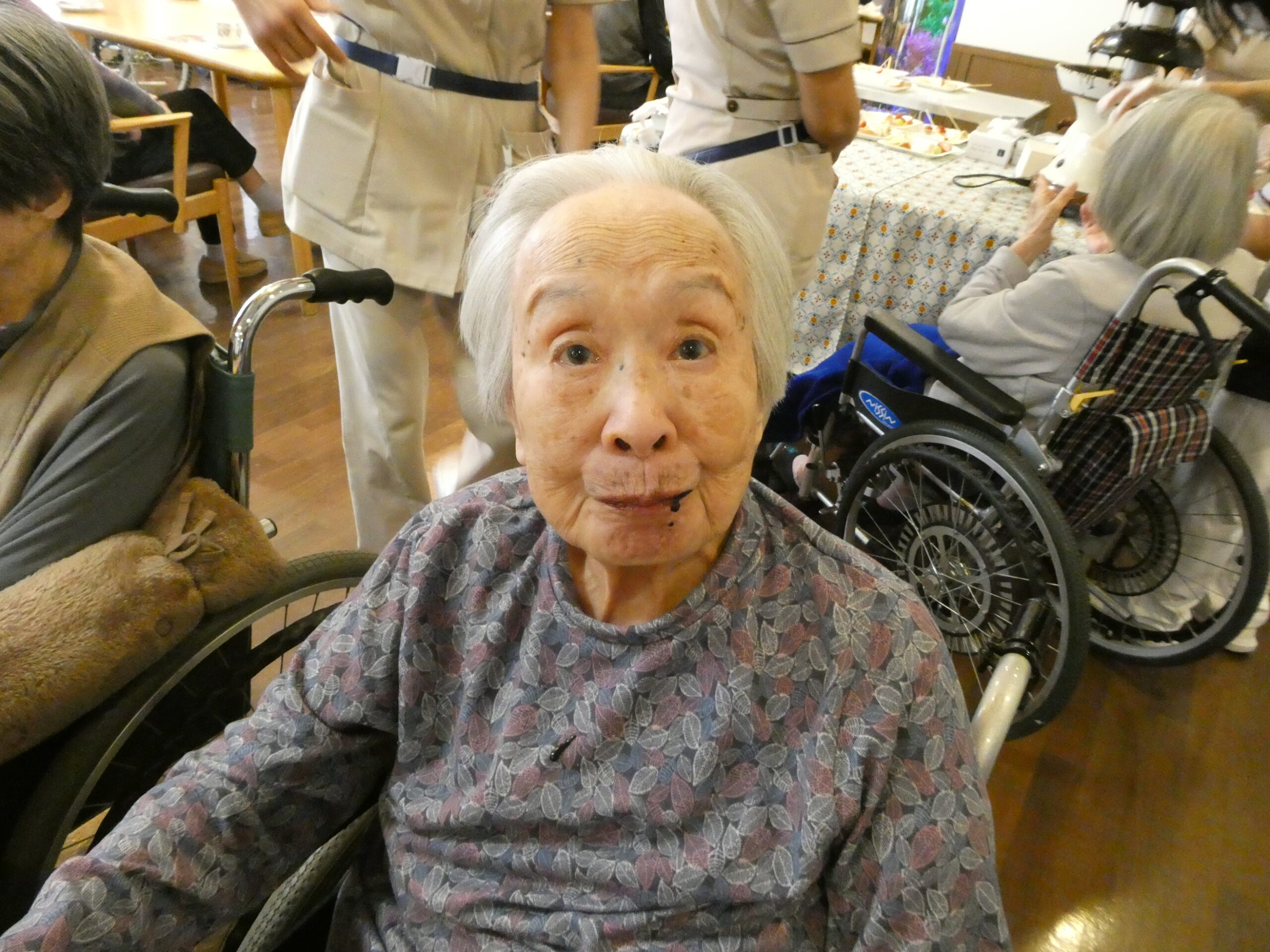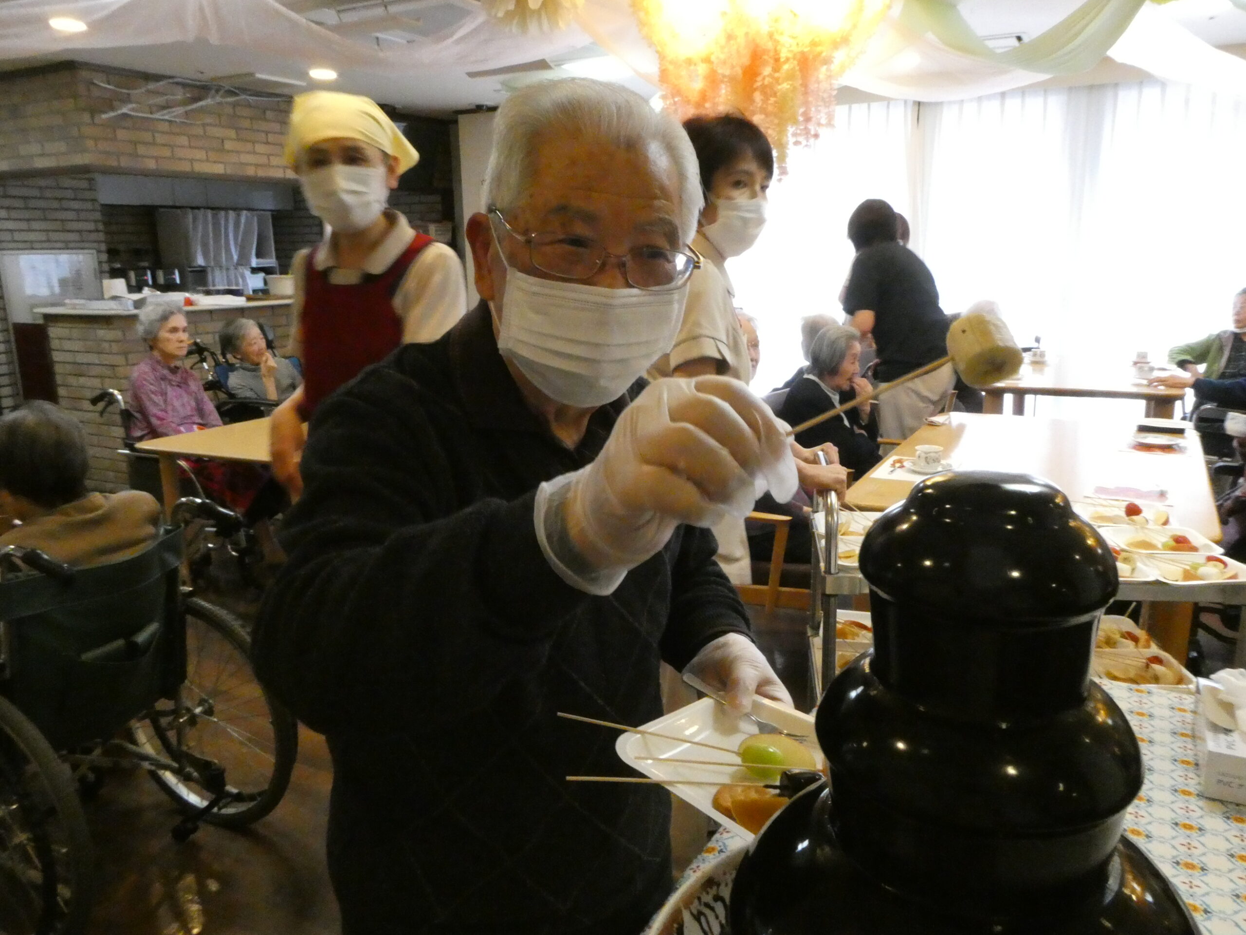チョコレートファウンテンは初めてのご入居者が多く、皆さん興味津々、果物やお菓子にチョコレートをつけて、お腹いっぱい召し上がられました。