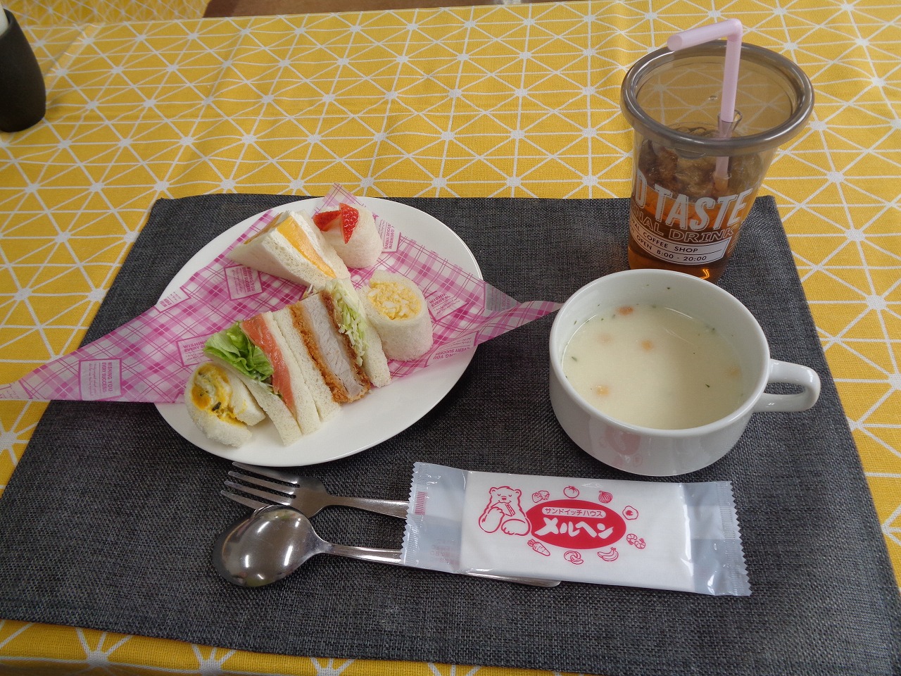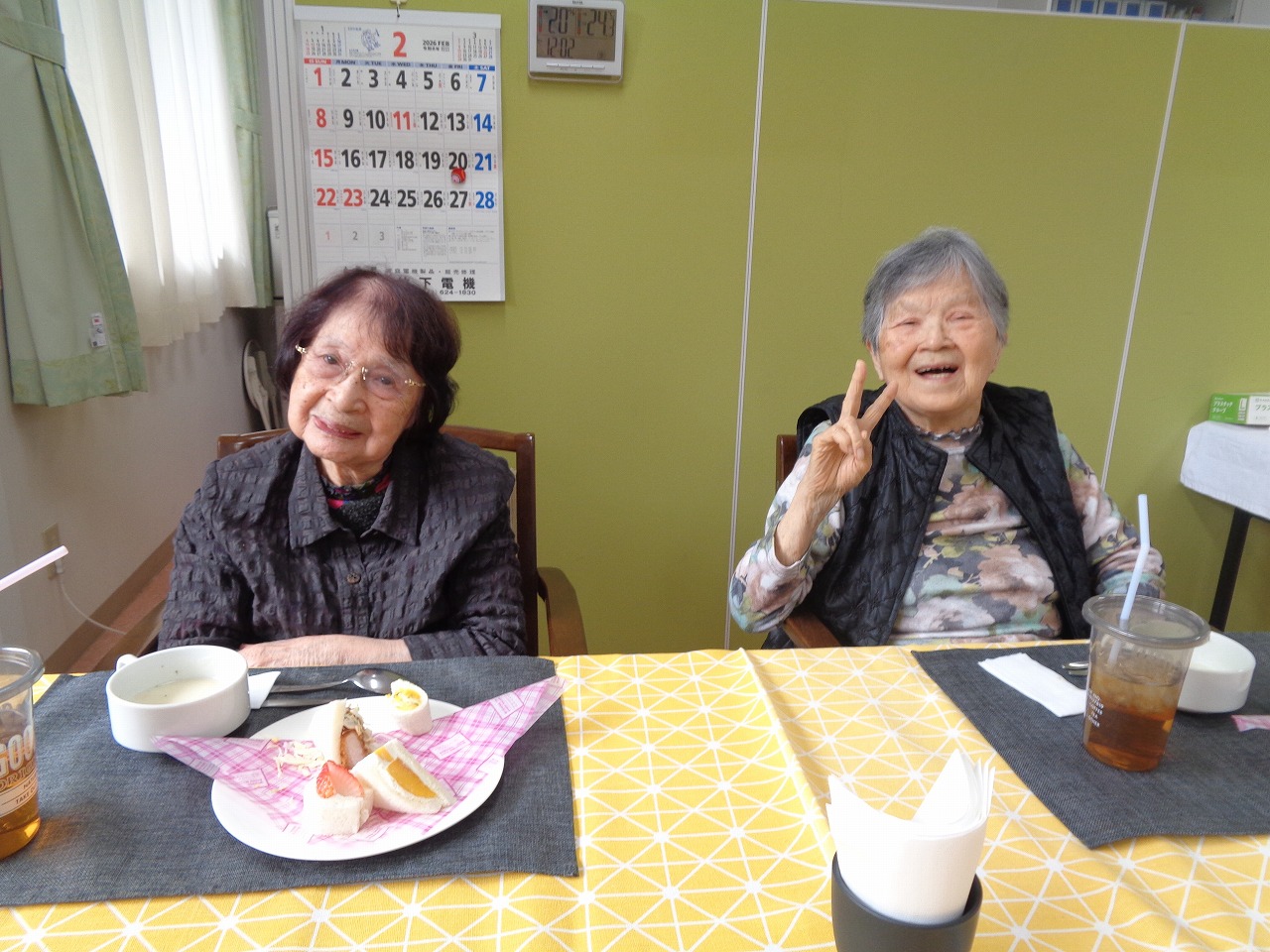 本日は日野リハビリ室にて昼食会を開催し、『メルヘン』のサンドウィッチを召し上がっていただきました。ハムやタマゴ、カツサンドなどの食べ応え十分のサンドウィッチと、イチゴ、甘夏など季節のフルーツのサンドウィッチをご用意しました。「おいしいわねぇ」「まだまだ食べられそう!」とおかわりされる方も!大好評で皆様完食して下さいました!