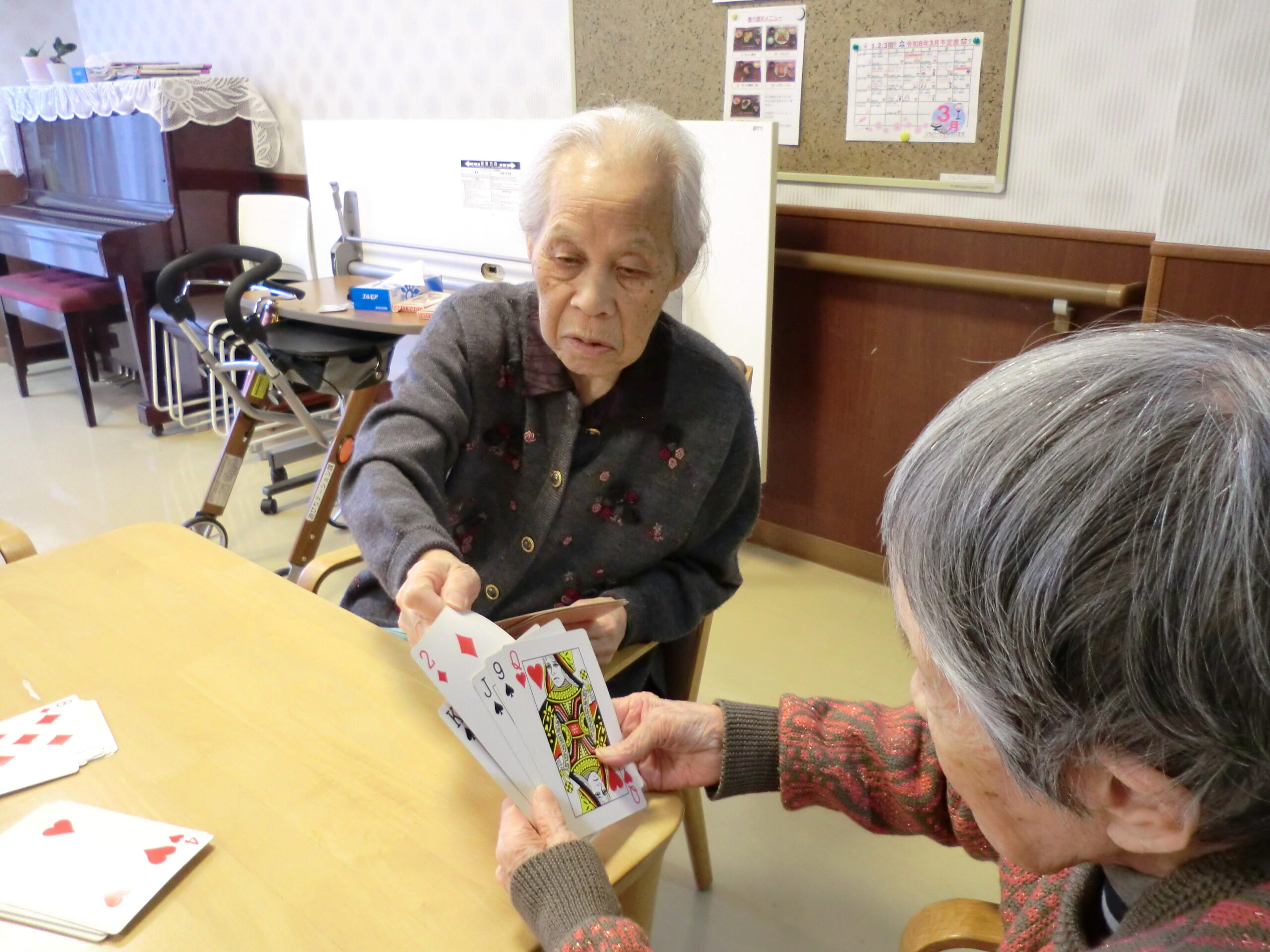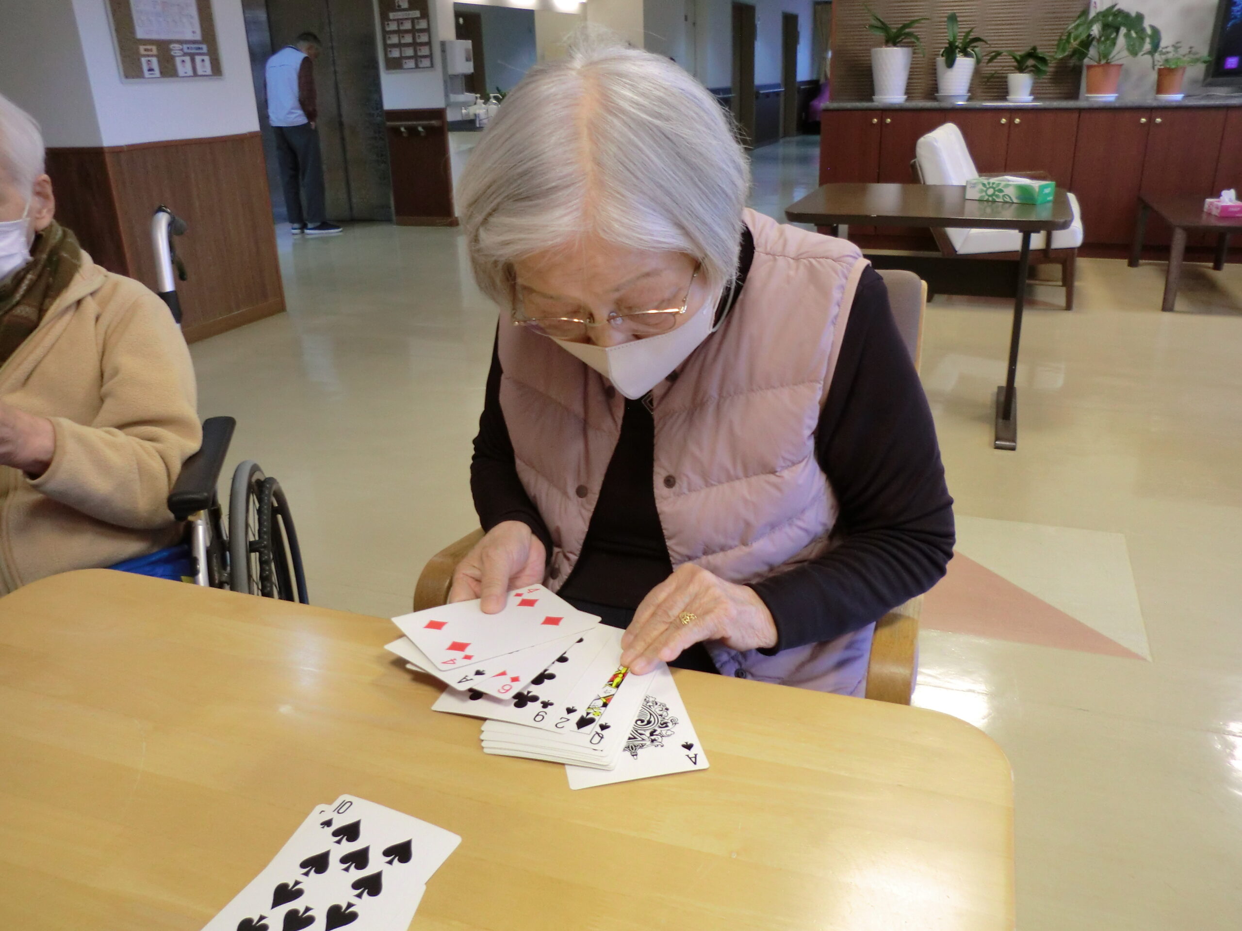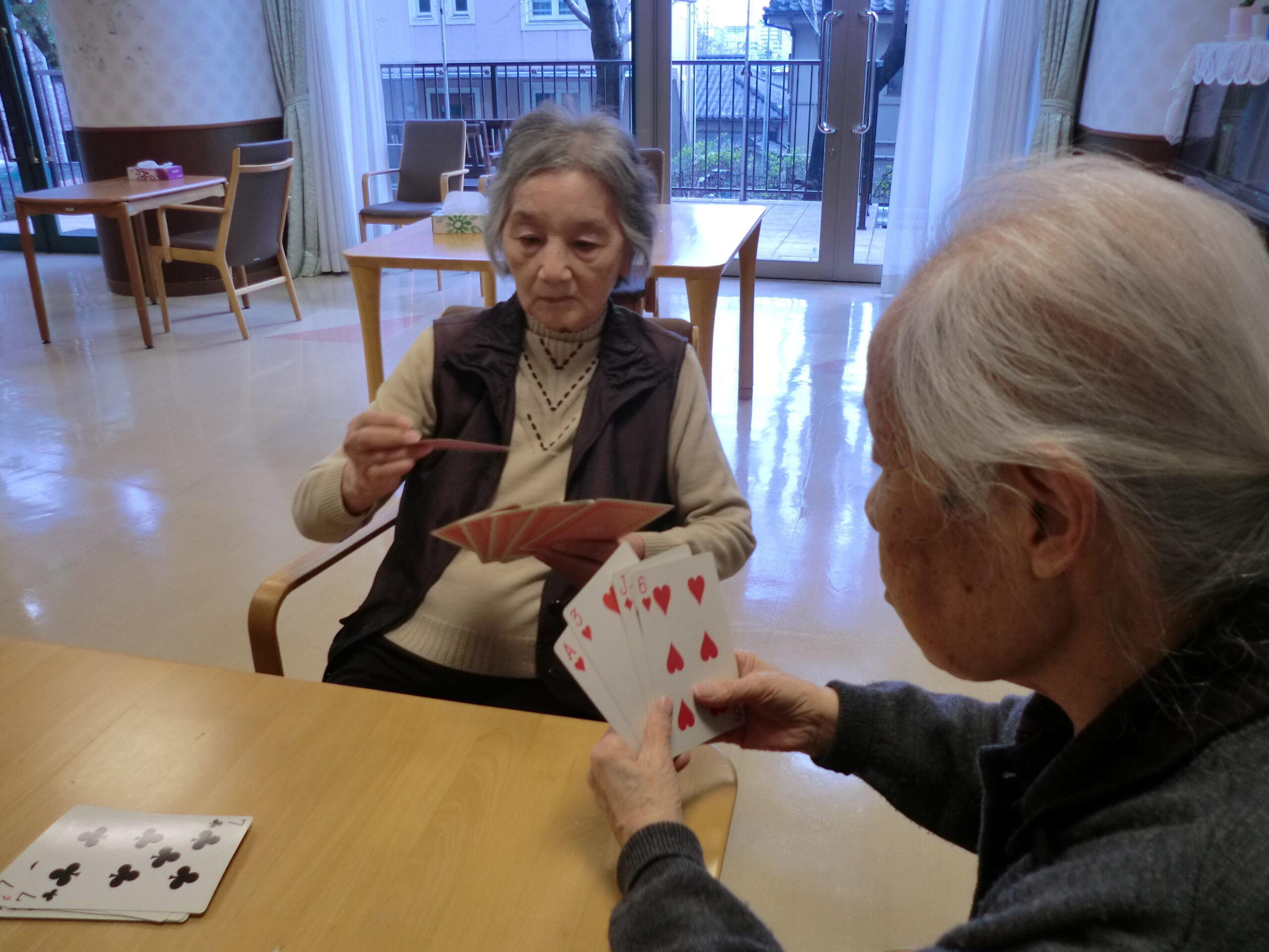 トランプで『七並べ』『ジジ抜き』を行いました!ジジ抜きは、トランプを2セット使って行いました(^^)/枚数が増え混乱するご入居者もいらっしゃいました。さらに、黒だけを使って、数字と記号の両方を一致させる特殊ルールで行ったりしました。普段とは違った形で「おもしろい」と皆様、楽しまれていました(*^-^*)