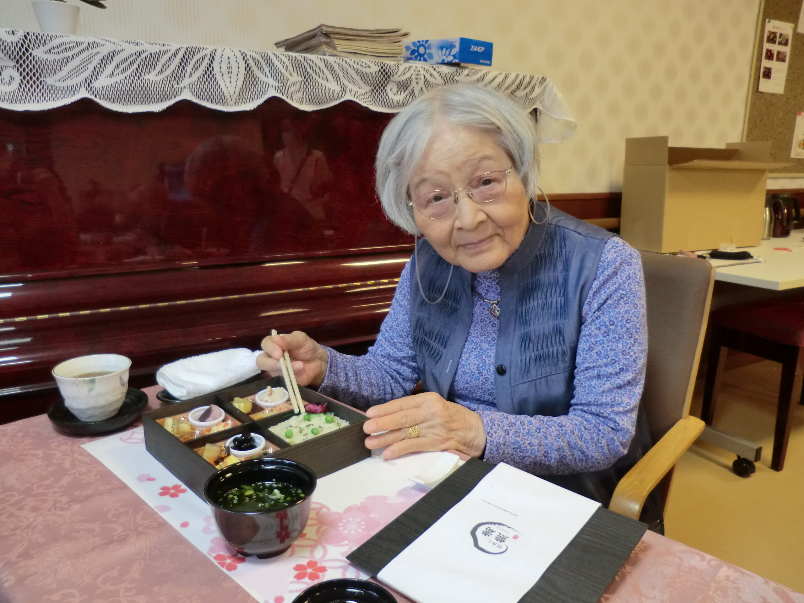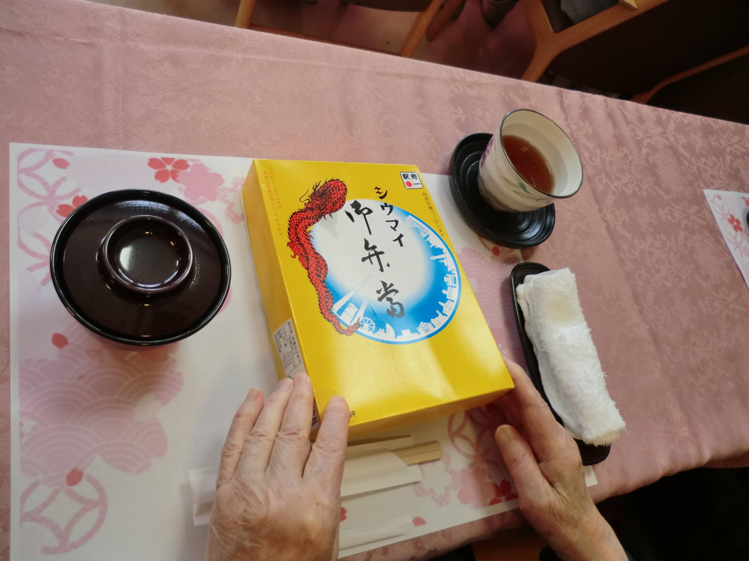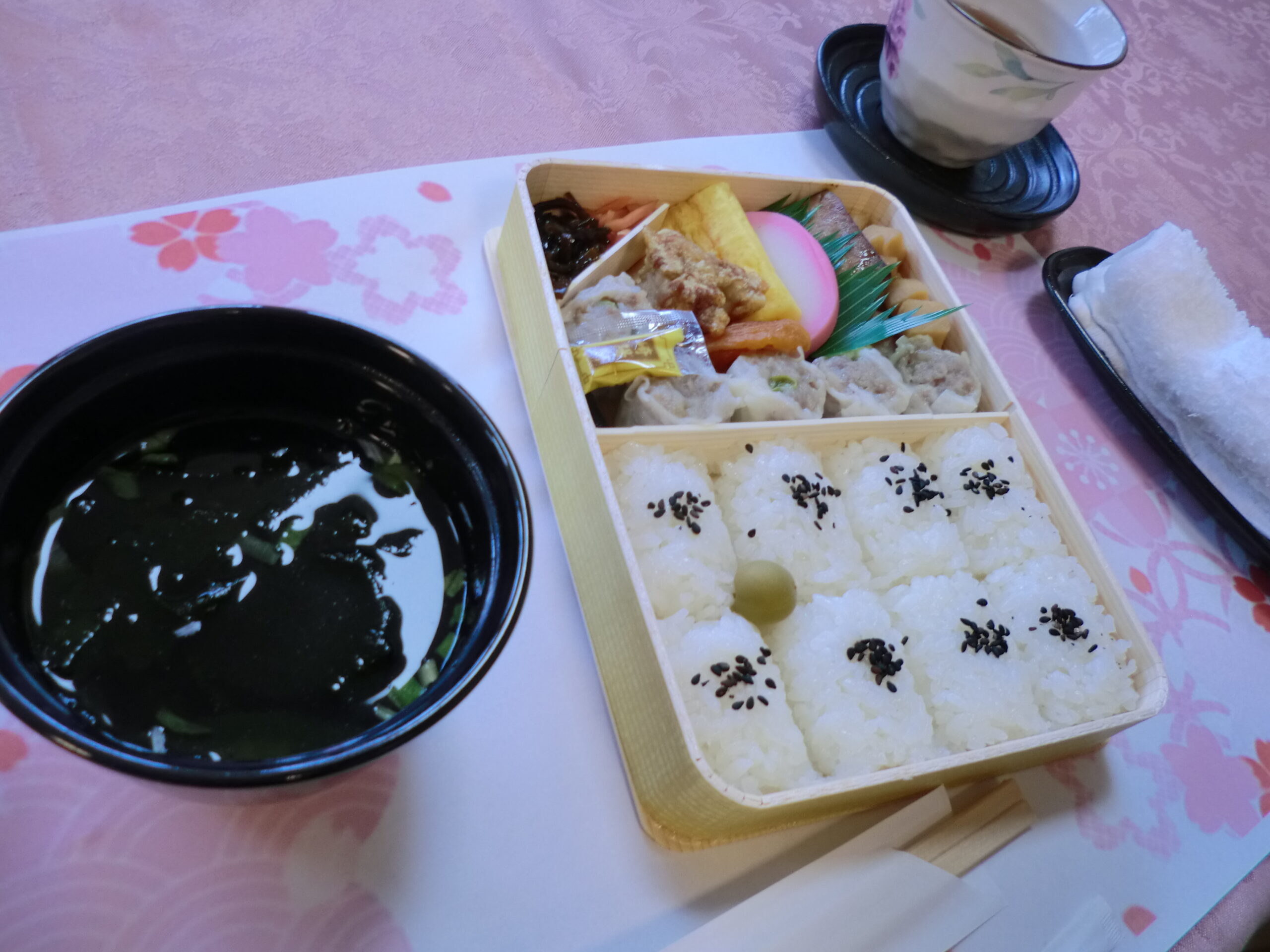 テラスでお食事の予定でしたが、生憎の空模様の為屋内からのお花見となりました。初日は崎陽軒の『シュウマイ弁当』 二日目は熊Tokyoの『季節の炊き込みご飯 華御膳』をご用意いたしました。天気は残念でしたが、お弁当を食べながら桜を楽しんで頂きました!来年こそは、テラスでお花見を楽しみたいですね(*^^*)