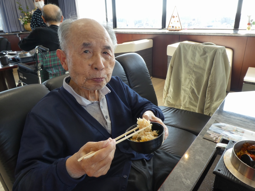 施設のテラスにあります花を眺めながら、昔話に花が咲きます。