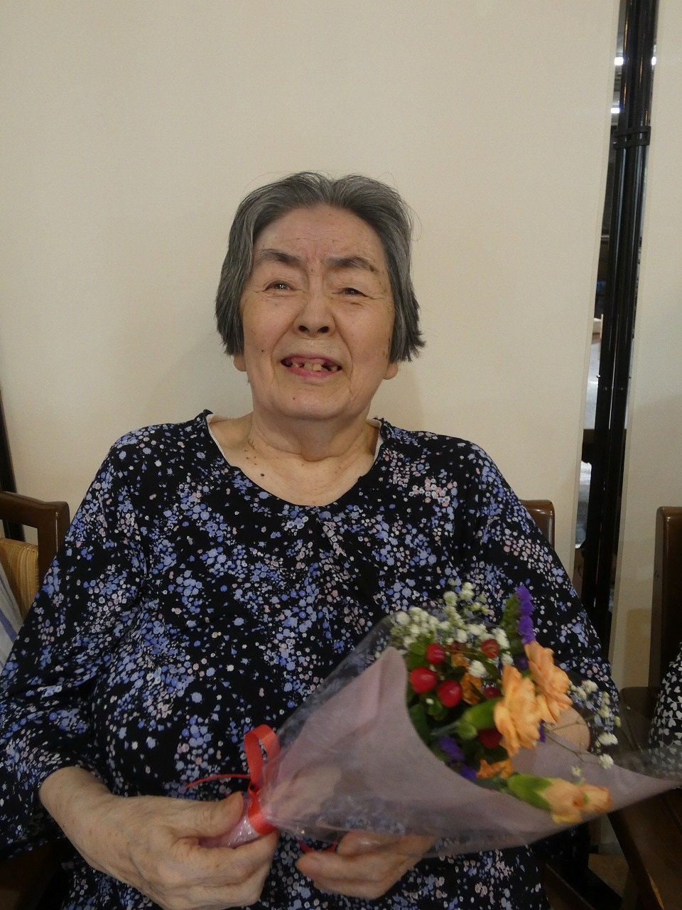 職員のピアノ伴奏で「バースデーソング」と小さな花束を贈ります♪