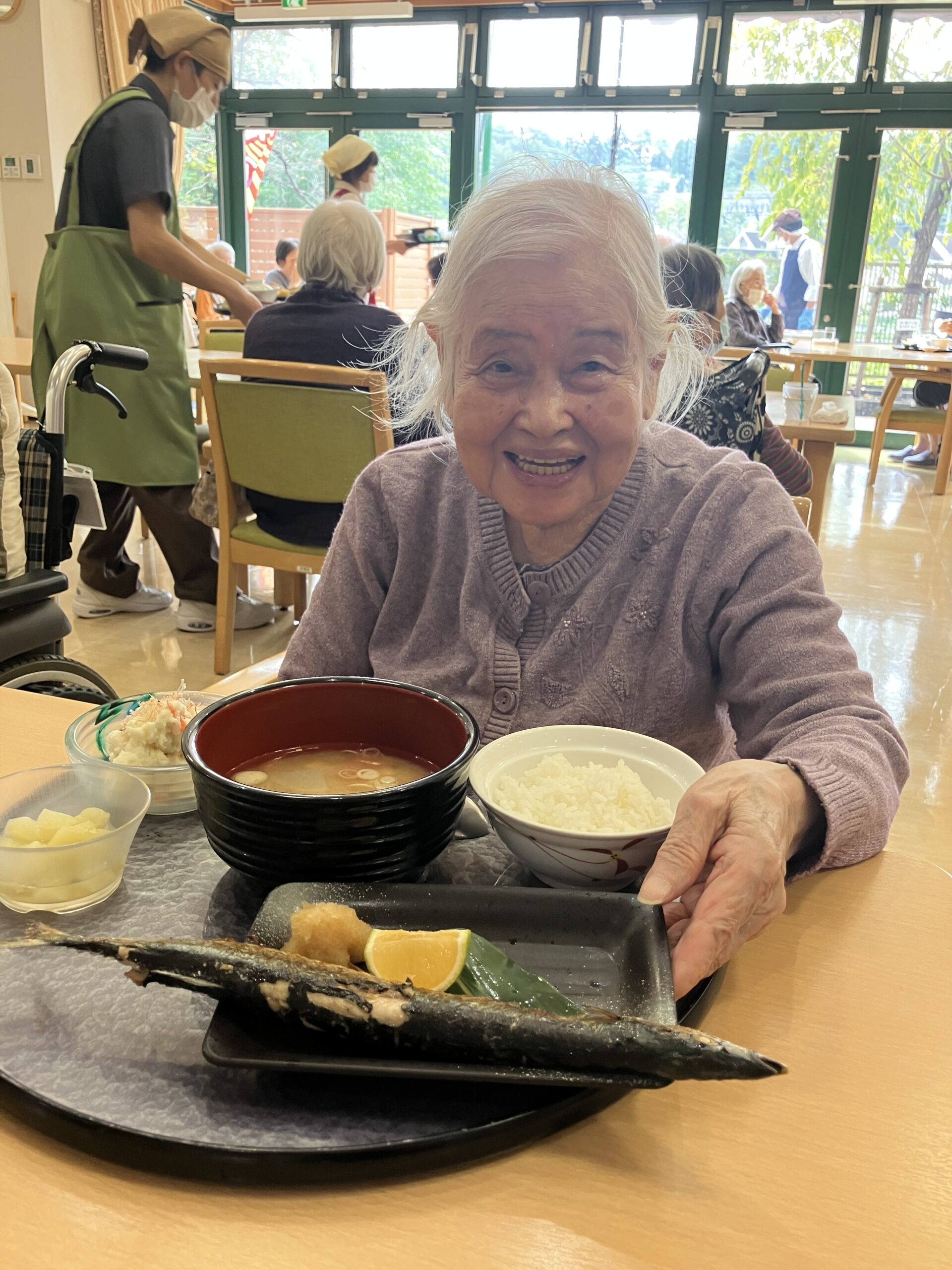 10月20日の昼食に、秋の味覚「秋刀魚」をテラスで香ばしく焼き、ご入居者の皆様に召し上がっていただきました♪焼きたての秋刀魚の香りがホールいっぱいに広がり、「いい匂いだね」「久しぶりに食べるわ」と笑顔が溢れていました。季節の味覚を楽しみながら、和やかな昼食のひと時となりました。