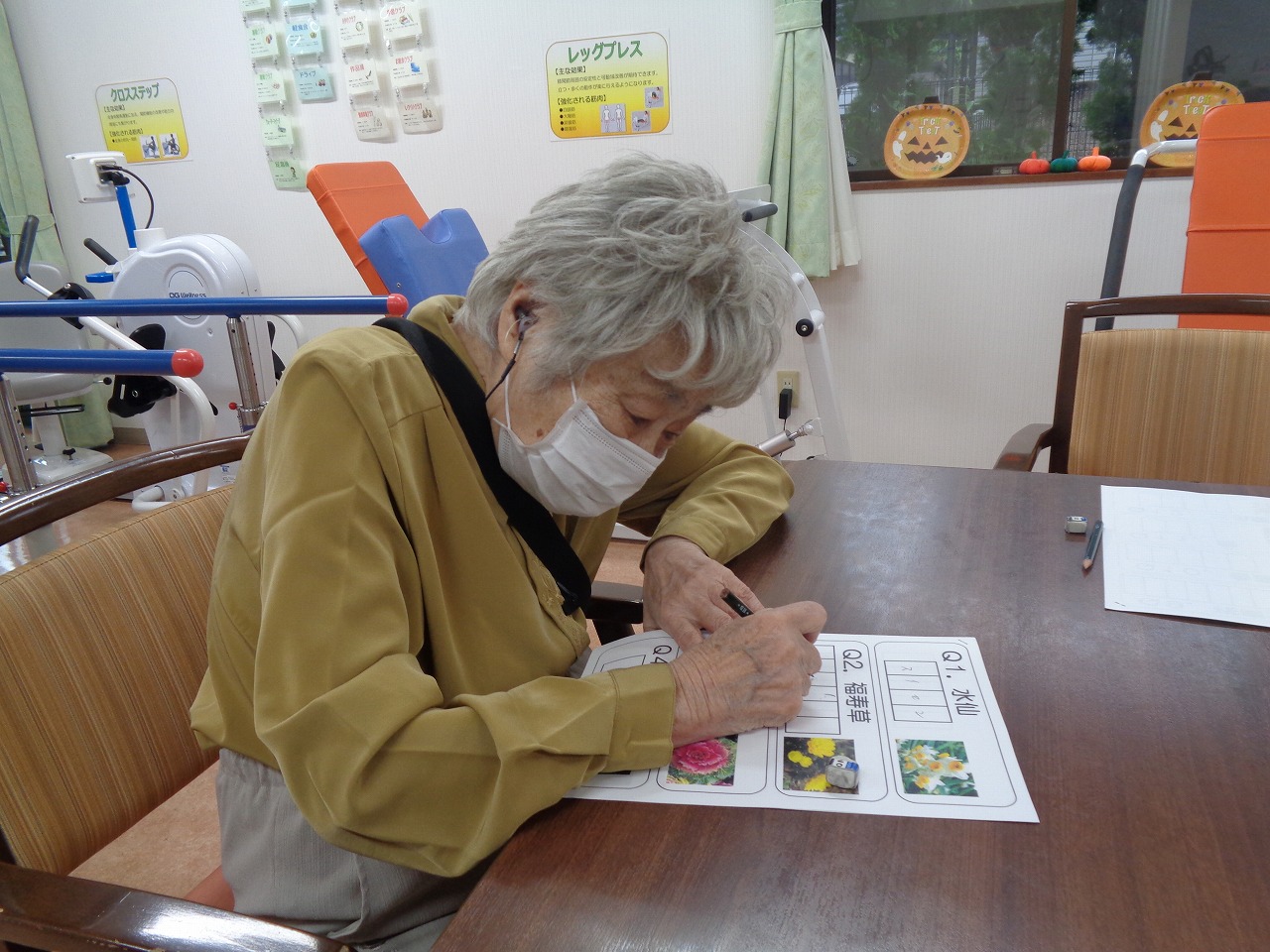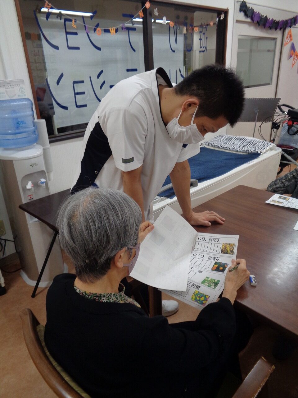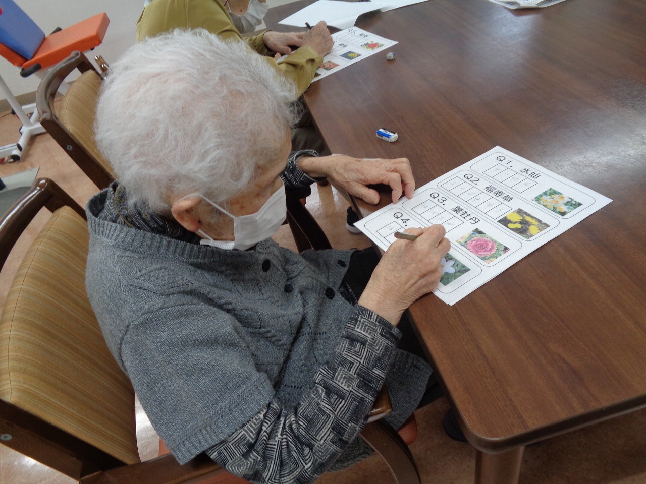 本日は日野リハビリ室にて学習クラブを開催し、冬のお花漢字読み方クイズに挑戦していただきました。花の写真をヒントに、「これはお庭で育てていたのよ」「昔はよく道端に咲いていたわね」と振り返りながら考えて下さいました。ご参加いただいた皆様、本当にお花に詳しく、私はただただ驚くばかりでした。