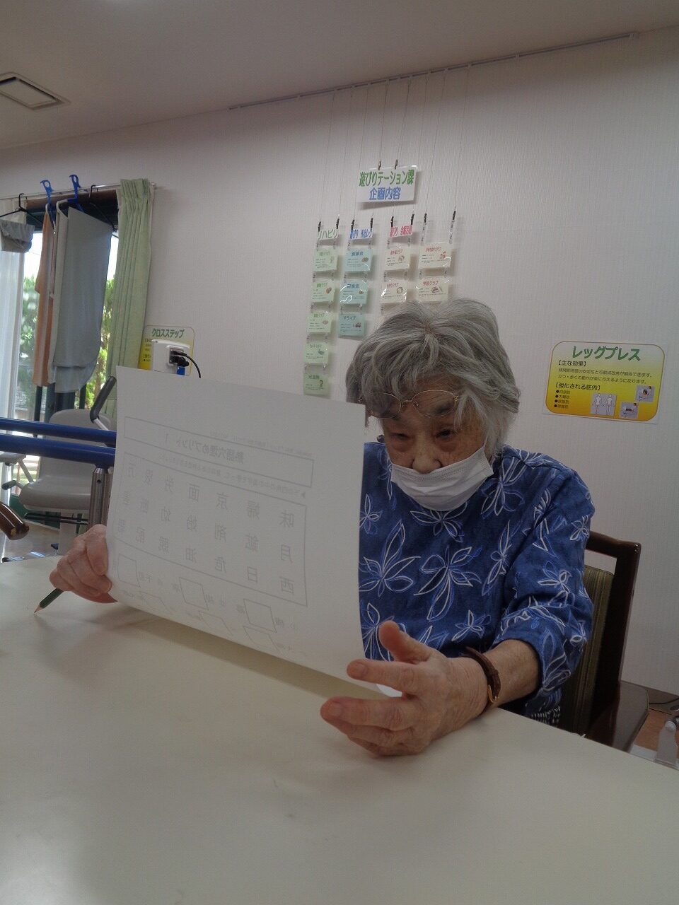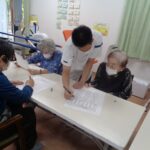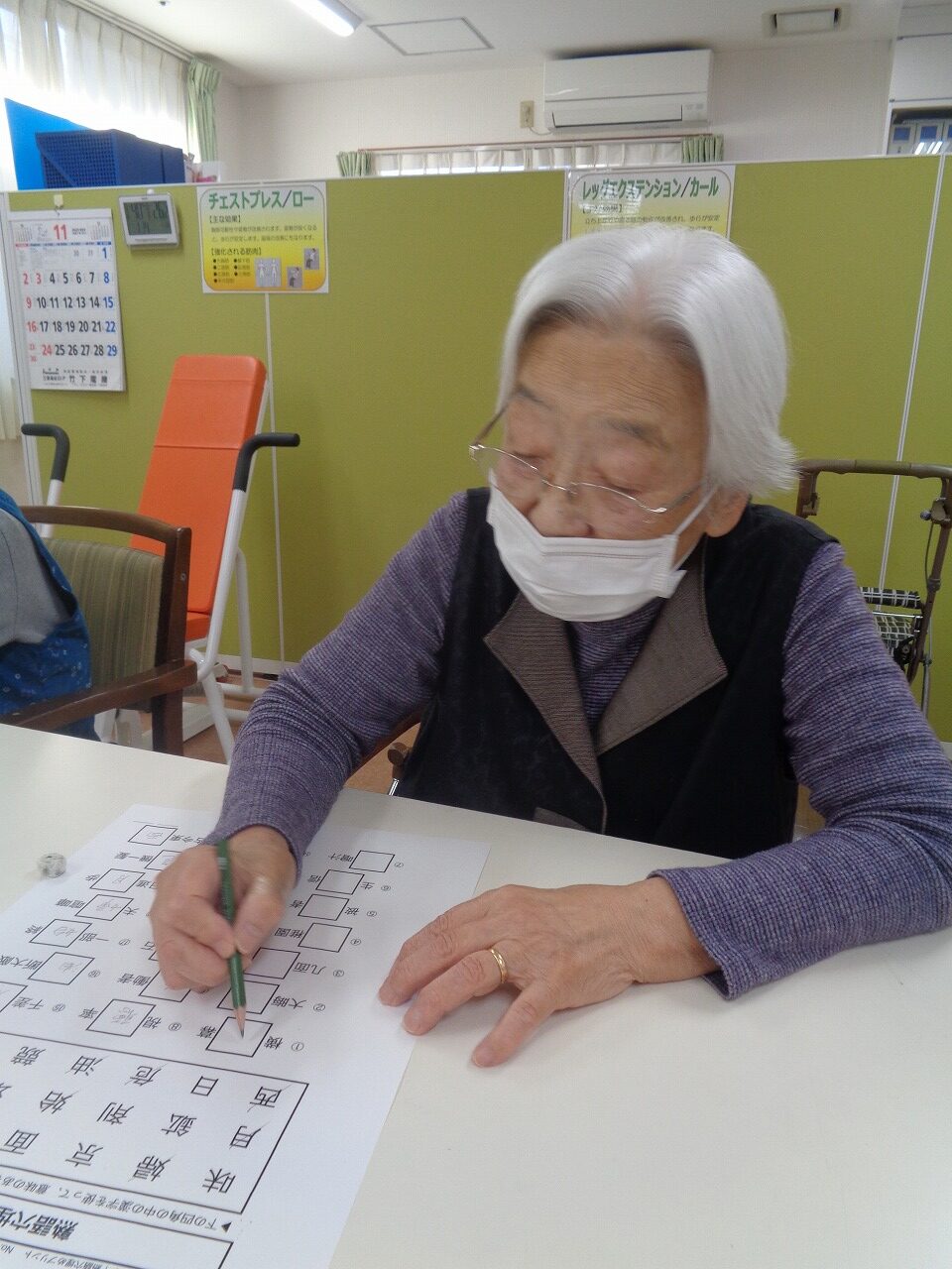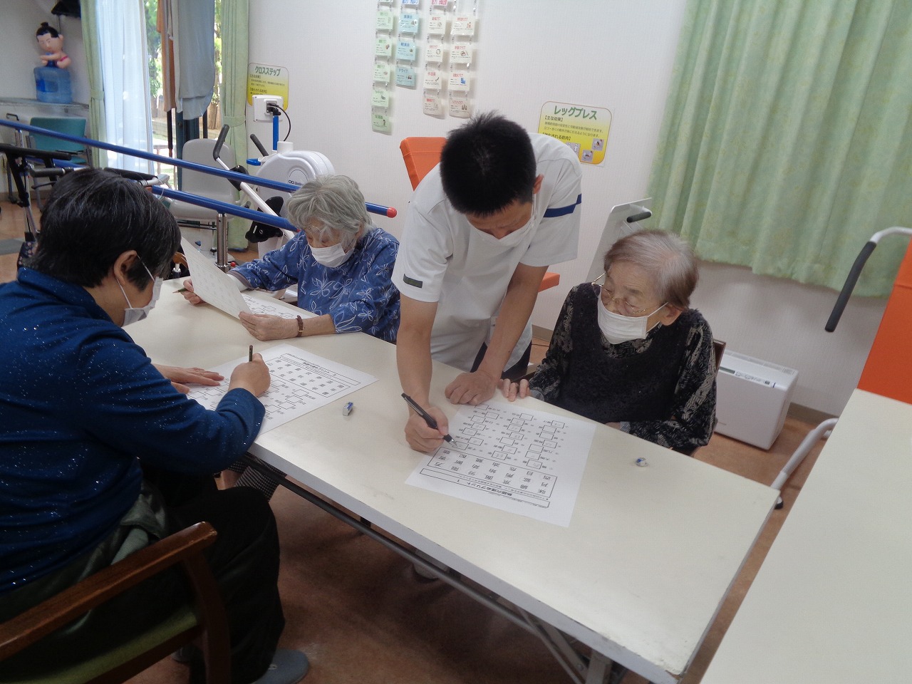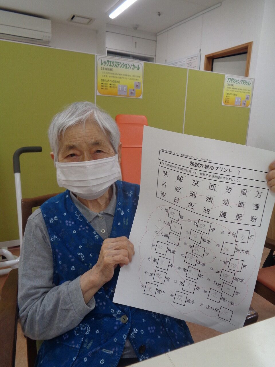 本日は日野リハビリ室にて学習クラブを開催しました。空欄のある熟語に、正しい漢字を選んで完成させる『熟語穴埋めクイズ』に挑戦していただきました。言葉を思い出しながら、読んで、書いて、「たまには字も書かないと忘れちゃうね」「なんだったかな~」と、話し合いながら協力して取り組んで下さいました。最終結果は、全ての熟語を完成させて、皆様全問正解でした!